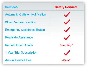 Safety Connect helps drivers stay secure on the road. Drivers can be in touch with our 24/7 response center at the touch of a button. In case of an accident, Safety Connect is like an added safety net. This service helps provide quick response and care from emergency service providers.Safety Connect availability varies per equipped model. Not available on vehicles manufactured prior to fall 2009.The following four safety and security features are available via Safety Connect. Subscription required.